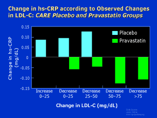 In the CARE trial, there appeared to be no relation between the change in CRP and the change in LDL-C attained by use of the study drug. Among patients with a similar reduction in LDL-C, those who had an LDL-C reduction on placebo had an increase in CRP, whereas those who had the same LDL-C reduction on pravastatin had a decrease in CRP. These data have also now been confirmed with several other statins and emphasize that statin therapy may involve several mechanisms in addition to reduction of LDL-C.
