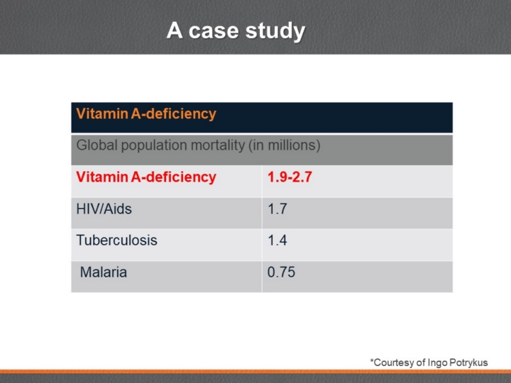 Golden Rice and Beyond - challenges of a humanitarian GMO project. I'll just quickly go through one or two cases to show you the effects. Vitamin A deficiency is a major problem in many poor countries. There's simply not enough beta-carotene in the diet of a lot of people to produce the Vitamin A that is necessary when babies are starting to develop. If they don't get enough Vitamin A they go blind, they have defects in their muscles, defects in their immune system. |