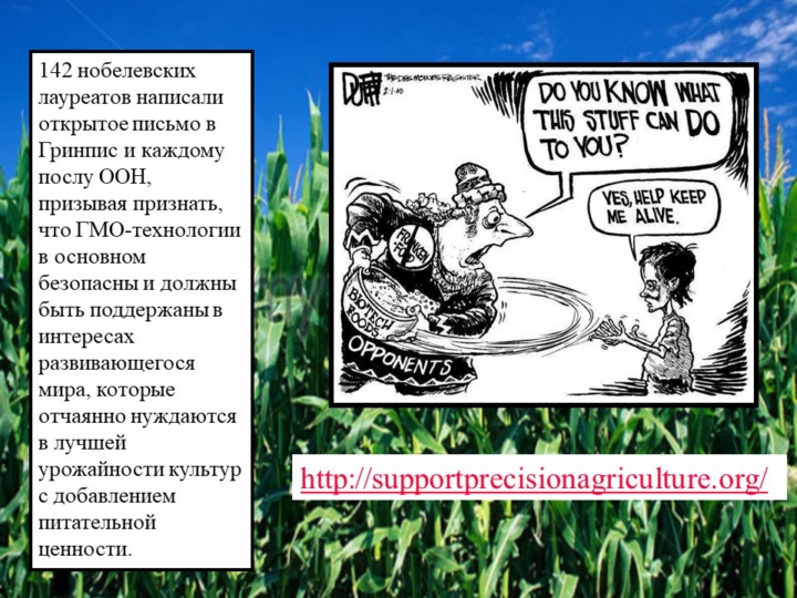 Этот плакат, который мы распространяли в то время, когда у нас было, я думаю, уже 107 участвующих Нобелевских лауреатов; а теперь уже 142. Персонаж слева, созданный карикатуристом из Айовы, по сути, пытается напугать вас тем, что может сделать ГМО, а справа - маленький мальчик, который видит в ГМО пищу. И я думаю, что вы можете понять, на какой стороне этого уравнения я стою. У нас есть веб-сайт Supportprecisionagriculture.org, с большим количеством информации о кампании, о том, что мы делаем, и о ГМО в целом, там перечислены имена всех Нобевских лауреатов, которые поддерживают ГМО. Вы тоже можете зарегистрироваться, присоединиться к нам, поддержать. Я советую вам зайти на сайт и поддержать. |