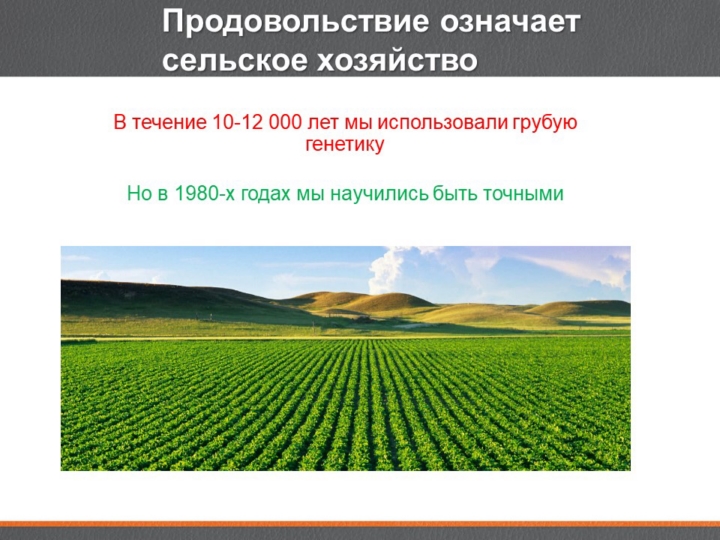 Теперь, одна из вещей, которую вы должны понимать - пища означает сельское хозяйство, а сельское хозяйство возникло около 10-12 000 лет назад, когда охотники/собиратели поняли, что вместо того, чтобы каждый день ходить в лес, чтобы найти пищу, которую они хотели бы съесть, они могли бы пересадить из леса некоторые растения и выращивать их возле своих жилищ. И таким образом, со временем, они обнаружили, что некоторые растения росли намного лучше, чем другие, они обнаружили, что иногда, когда у них было два растения, растущих вместе, они перекрестно опылялись, и у них появлялись новые сорта, которые на самом деле были лучше, чем те, которые они выращивали ранее. Это было начало генетической модификации, которая происходит в растениях, и это происходит уже в течение 10 или 12 000 лет с использованием методов, которые считаются естественными, то есть именно тем способом, которым природа воспроизводится. Если подумать об этом, то каждый раз, когда мы зарождаем ребенка, этот ребенок генетически модифицирован, у него есть несколько генов от матери, несколько от отца и он обычно не похож как две капли воды на одного из родителей. То же самое происходит и с растениями, когда вы скрещиваете растения, вы получаете смесь генов. |