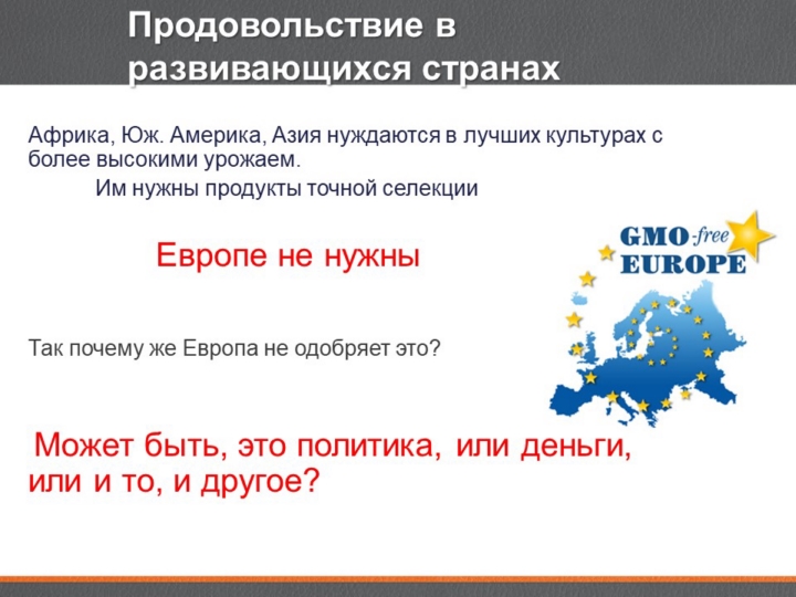 Теперь я хочу поговорить о еде в развивающихся странах, потому что это то, что действительно касается Нобелевской кампании. Если честно, нас не волнует США или Европа или то, что они хотят делать. Там нет недостатка в продовольствии. Посмотрите вокруг, вы не найдете много худых европейцев. Тощие европейцы давно исчезли. И поэтому, когда я начал думать о том, где нужна пища, она как правило нужна в развивающихся странах. Там вы найдете маленьких детей, которые не получают достаточно еды и не получают полноценного питания. Вы можете подумать о том, что мы можем улучшить их культуры, используя эти новые точные методы, используя методы ГМО, где это действительно необходимо в развивающихся странах. Европе они не нужны, так почему бы Европе быть против этих конкретных методов, которые могут помочь развивающемуся миру, если они им не нужны в Европе? Так почему же они этого не делают? Как вы думаете, это может быть политика? Это могут быть деньги? Ну, на самом деле это и то, и другое. |