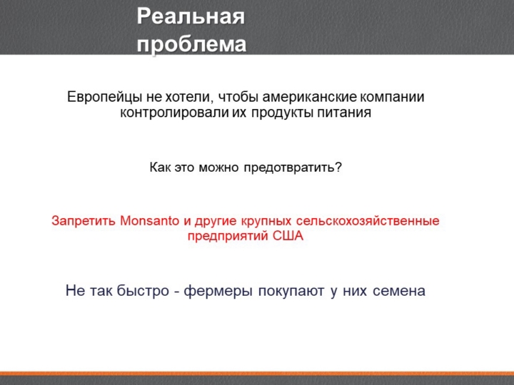 Что произошло, так это то, что европейцы не хотят, чтобы крупный агробизнес контролировал их собственные продукты питания, и когда Monsanto впервые представила ГМО продукты в Европе, они подумали, что Monsanto пытается захватить их продовольственный рынок, и вы знаете, что европейцы так же заинтересованы в продовольственная безопасности, как и все мы. Но у Гринписа было пробуждение. Они поняли, что это был способ противостоять ГМ-продуктам. Возможно, изначально у них были хорошие идеи. Первоначально, их позиция была что ГМ продукты могут быть опасными (МОЖЕТ БЫТЬ)! Обычно, если вы слушаете их, они должны проверить это, они должны проверить то. Убедитесь, что они в порядке. Ну, все эти тесты были выполнены, но Гринпис все еще не удовлетворен этим. Почему? Потому что это лучшая кампания по сбору средств за всю историю Гринпис. Знаете ли вы годовой бюджет Гринпис? Я уверен, что нет, и я не знаю. Но есть люди, которые оценивают эти вещи, вы знаете, что Гринпис не делает это публично доступным, но люди, которые оценивают это, оценивают бюджет в 500 миллионов евро в год. Это некоммерческая организация, и откуда начали поступать все эти деньги? Это начало литься, как только они начали свою кампанию. Теперь, конечно, вы могли бы сказать, что нам не нравится Monsanto, поэтому мы просто запрещаем Monsanto. Ну, это не сработает. И почему это не сработает? Потому что фермеры покупают свои семена через Monsanto, и они не могут себе позволить не делать этого. |