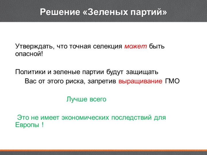 Итак, вы говорите всем, что этот метод точной селекции, эти ГМО, опасны. И с самой старой политической уловкой в игре, они говорят, что Мы защитим вас! Голосуй за нас! Мы будем защищать вас. Мы защитим вас от этих опасностей. Таким образом, Гринпис и партии зеленых в целом не только заработали много денег на схемах сбора средств, но и получили политическую власть, и это все еще очевидно сегодня, если вы посмотрите на Европу, партии зеленых имеют большую власть и все это произошло из-за их кампании против ГМО. Таким образом, вы можете понять, почему Гринпис не очень-то хочет сказать, что на самом деле, с ГМО все в порядке, хотя они утверждают, что являются учеными, они должны знать науку, они просто лгут об этом и не будут обсуждать это. Я пытался встретиться с лидерами Гринпис, чтобы поговорить с ними об этом, потому что у меня есть идеальное оправдание, которое они могут использовать, чтобы выступить в пользу ГМ-продуктов, и это то, что, ну, мы были правы все вместе. Мы попросили провести эксперименты, эксперименты были проведены, они ясно показали, что они безопасны. Теперь мы поддерживаем ГМО продукты, и теперь мы продолжим и сделаем все хорошо, как мы делали в других сферах. Они не будут этого делать, они даже не будут говорить со мной. И конечно то, что происходит в Европе, быстро распространяется. И поэтому они не могут поспорить, ну, в Европе эти вещи опасны, вы знаете, что европейцы действительно не могут принять эти вещи. Но для развивающихся стран они в порядке. Итак, что же они делают? |