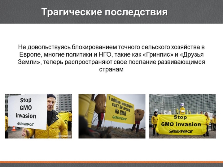 Они отправляются в развивающиеся страны и убеждают ваши правительства в том, что это опасно. И теперь мы видим, что многие, многие страны полностью запретили ГМО из-за этого страха, распространяемого движением против ГМО.