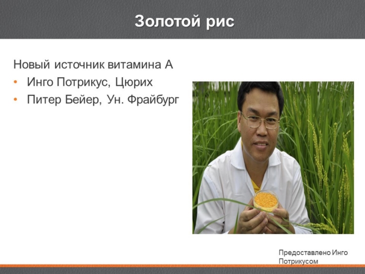 Двое мужчин, Инго Петройкус и Питер Бейер решили, что собираются что-то с этим сделать. И они подумали, что рис является основной культурой для многих из этих людей. Что, если бы мы могли поместить гены, которые будут производить бета-каротин, в рис? Таким образом, люди будут получать достаточно витамина А, потому что бета-каротин является предшественником витамина А, что они могли бы получать достаточно в рационе, тогда дети больше не будут слепнуть. Так они и сделали. |