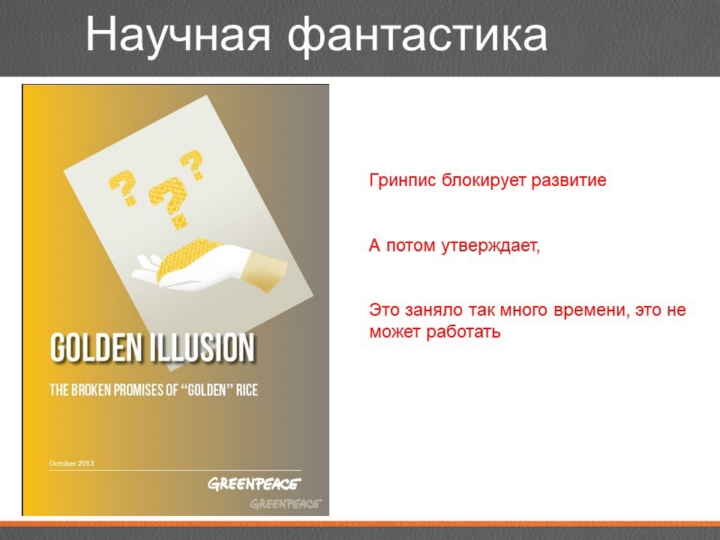 Здесь «научная фантастика» начинает кампанию против ГМО. Золотой рис, они поняли, что Золотой рис на самом деле был фармацевтическим препаратом. Это была не просто пища, это был фармацевтический препарат. И одним из больших преимуществ, которые дает технология ГМО, являются такие вещи, как человеческий инсулин. Вы знаете, если вы диабетик, вы можете принимать человеческий инсулин. Откуда это? Ну, это не от людей. Хорошо, откуда он берется, он поступает из бактерий или дрожжей, которые были разработаны для производства человеческой версии инсулина. Это ГМО. Вы когда-нибудь слышали от Гринписа что-нибудь негативное по этому поводу? Я никогда не слышал от них ничего негативного об этом. Но это ГМО, и я думаю, они увидели, что это будет точно такая же ситуация. |
