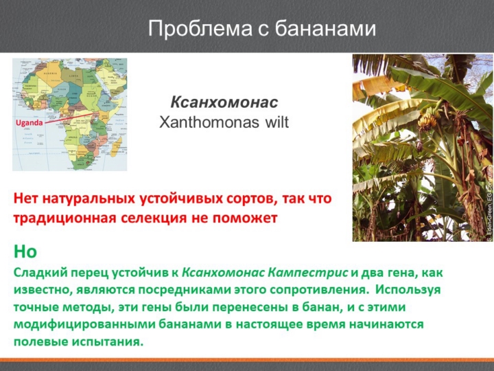 Теперь я быстро пройдусь по одной или двум болезням, которые угрожают странам Африки, и их очень легко решить. Первым из них является Xanthomonas wilt. Это бактериальная болезнь, которая убивает бананы. Нет естественного решения, поэтому нельзя использовать традиционные методы. Нет сорта банана, который был бы устойчив к этому. Но сладкий перец имеет два гена сопротивления этой болени. Если вы перенесете эти гены в банан, то тогда банан будет устойчив к Xanthomonas wilt. |