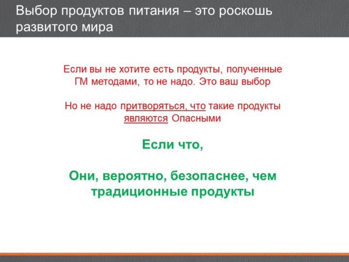 Итак, суть состоит в том, что если вы не хотите есть пищу, полученную с помощью методов ГМ, то не стоит. Это ваш выбор. Никто не заставляет. Но, во всяком случае, ГМ продукты, вероятно, безопаснее, чем традиционные продукты. Не говорите, что вы их не едите, потому что они опасны. |