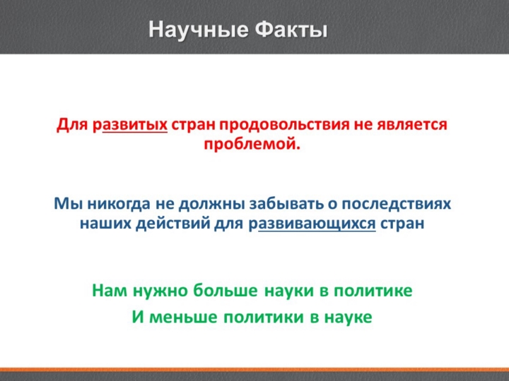 Для развитых стран еда не является проблемой, за исключением тех, которые справедливо не распределяют ее среди бедных людей, но для развивающихся стран это серьезная проблема, и дело не только в количестве пищи, но и в питательной ценности продуктов питания, и все это можно улучшить с помощью методов ГМ. Суть в том, что нам нужно гораздо больше науки в политике и в идеале, намного меньше политики в науке. |
