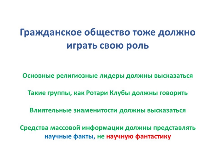 Что нам нужно сделать, так содействовать каким-то действиям гражданских лидеров, должны выступить крупные религиозные лидеры. Мы пытаемся заставить Папу сделать заявление по этому поводу, потому что это может оказать большое влияние. Но есть много других групп, которые в основном выступают за ГМ. Они должны говорить. В идеале одна из стран, которую представляет кто-то в этом зале, решит, что с ГМ-продуктами все в порядке, мы не собираемся устанавливать эти чрезвычайно сложные правила, которые необходимо соблюдать. Знайте, что стоимость производства генетически модифицированных культур по сравнению с обычными настолько велика, что только крупные агробизнесы могут себе это позволить. И это было то, что Гринпис пытался остановить, крупные агробизнесы. Но теперь это так легко сделать, вы можете сделать это, ваши ученые могут сделать их в вашей стране, сделать их доступными, местные компании могут участвовать, чтобы поддержать их, чтобы продать их людям. Скажите европейцам идти в ад. Это мое сообщение. |