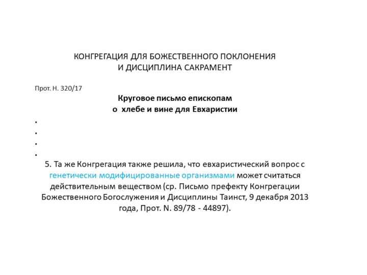 Вот интересная вещь … Это лучшее, что я слышал от католической церкви. Ватикан рассказывает католикам, как они должны себя вести. Что хорошо, а что нет. Теперь в одном из великих таинств Мессы они пьют вино и едят хлеб. Конгрегации, которые устанавливают эти правила, решают, что это приемлемая евхаристическая материя, если это было сделано из генетически модифицированных организмов, это было бы хорошо, но если это было без глютена, очевидно, не работает.... Это лучшее, что до сих пор выходило из католической церкви по этому поводу. |