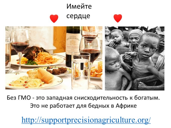 И наконец, на моем последнем слайде я говорю «Имейте сердце». Хорошо. Без ГМО - это западное потворство богатым, но оно просто не работает для бедных людей. Взгляните на сайт, войдите в систему, подпишите, и подумайте, что вы можете сделать для своей страны. Спасибо.