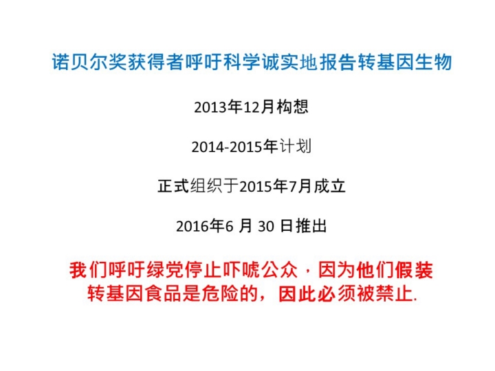 因此,这次运动于2016年6月30日正确启动,我当时在华盛顿举行了一次新闻发布会。我们有几个诺贝尔奖获得者打电话进来并发表了一些评论,我们做了我们所能做的,此后,我们得到了大量的新闻报道。我们给绿色和平组织写了一封信,给纽约每个联合国代表团团长写了一封信,基本上,我们问的是,为什么您不停止用这些不真实,没有任何科学依据的故事来吓唬公众。科学已经证明了转基因生物是绝对安全的,从来都没有一个可信的问题出现。现在,您可以去听听反对GMO的积极分子,他们会告诉您这些或哪些跟GMO相关的癌症的故事。即使其中一些发表在科学文献中的故事,没有一个是经的起重复和反复推敲的。就转基因生物而言,塞拉利尼也许是最大的敌人,他发表了一篇论文,说一些老鼠得了癌症,人们读了这些研究,并说那不可能是真的。他没有正确地进行实验,科学性很差。他因此被迫撤回论文,那家杂志拒绝重新发表他的文章。那他怎么办?他将其发表在另一本没有同行评审的期刊上。如果您听取反GMO份子的声音,哦,他们是不会告诉你这个故事背后的真相的。塞拉利尼这个人一直在做的事情绝对是可怕的。所以,这就是我们支持GMO运动的开始。
