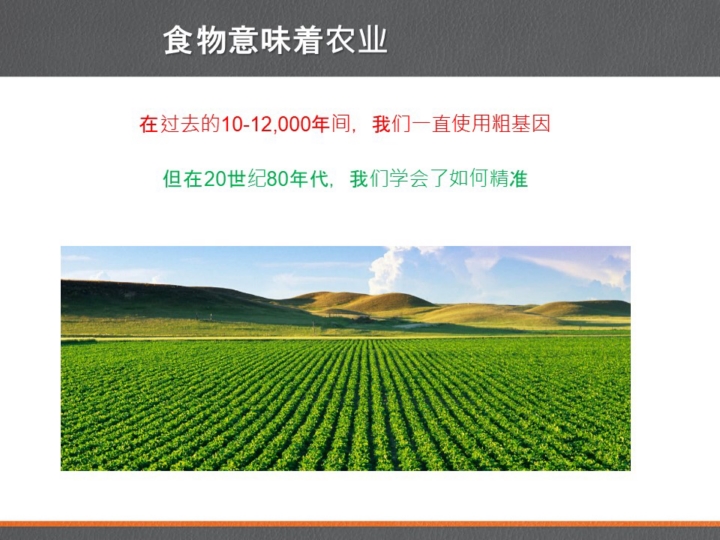 现在 [RR6],您必须意识到的一件事是,食物意味着农业,农业大约在10-12,000年前就开始了。当时猎人/采集者意识到如果他们把一些植物种在后院的话,他们其实不必每天去森林里寻找他们想要吃的食物。这样,随着时间的推移,他们发现有些植物要比其他植物生长好得多,他们还发现,有时如果您将两种植物种在一起,它们就会异花授粉,并产生一些比以前还要好的新品种。这是在植物中发生的基因改造的起源,在自然界已经进行了10或12,000年自然繁殖的方式。让我们来换一种思维方式,每一个婴儿的诞生都意味着基因改造,因为它有一些来自母亲的基因,一些来自父亲的基因,通常看起来谁都不像。同样的事情也发生在植物身上,当您架接植物时,您会得到基因的混合物。