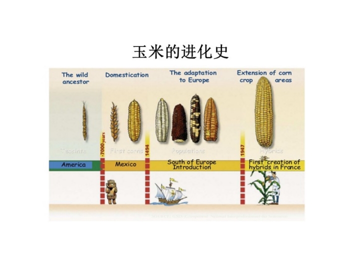 [RR7]接下来我们来看一下玉米的进化。,那么在右侧,您可以看到西方近来大多数超市中的玉米是什么样子,左侧是Teosinte。这是曾经在中美洲森林中生长的原始玉米。它看起来一点也不像今天生长的玉米。在人类逐渐筛选的进程里,因为我们不断选择了看起来不错,卖得很好,味道很好的东西,于是就 产生了我们今天这种漂亮的玉米,这就是我们千百年来种植植物的方式。