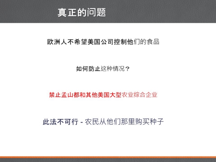 事实是欧洲人不希望大型农业综合企业[RR15]来控制自己的食物,当孟山都公司将转基因食品首次引入欧洲时,他们认为孟山都公司正试图接管其食品供应,而且您知道欧洲人对粮食安全是很关心的。这个情况給绿色和平组织敲了一记响钟,他们意识到这是反对转基因食品的方法。也许最初他们可能有一些好主意。最初,他们本来的立场是转基因食品可能很危险(可能)。通常,如果您听他们的话,他们需要测试它们,他们需要测试它们。确保它们没问题。好了,所有这些测试都已经完成,但是绿色和平组织对此仍然不满意。为什么?因为这是绿色和平组织有史以来最好的筹款活动。您知道绿色和平组织的年度预算吗?我确定你不知道,我也不知道。绿色和平组织是不会公开提供这些信息的。但是估计人士,估计每年大约5亿欧元。这是一个非营利性组织,所有这些资金从何而来?他们从开始反对GMO后捐款就开始涌现。现在,您当然可以说很好,我们不喜欢孟山都,所以我们就禁止孟山都。遗憾的是,那行不通。为什么行不通呢?因为农民是通过孟山都公司购买种子的,所以他们负担不起。 |