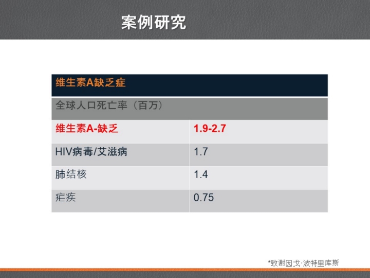 在许多贫困国家,维生素A缺乏症是[RR18]一个主要问题。许多人的饮食中根本没有足够的β-胡萝卜素来产生维生素A,而这正是婴儿开始成长所必需的。如果维生素A摄入不足,他们就会失明,他们的肌肉有缺陷,免疫系统也有缺陷。