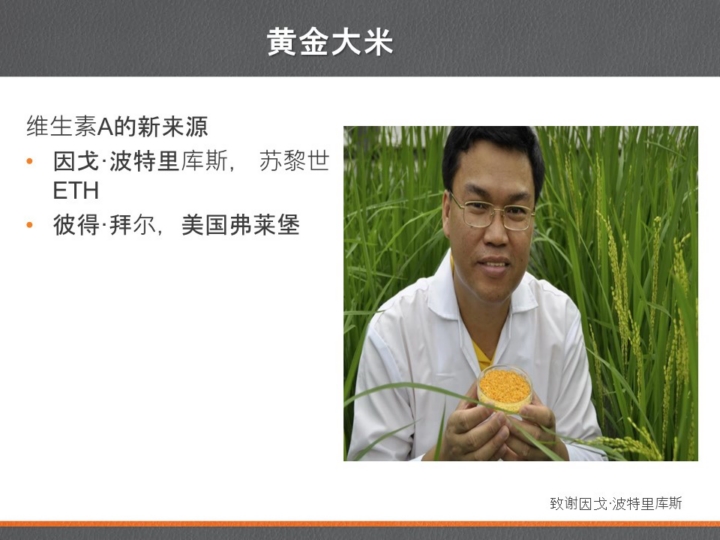 两位先生Ingo Petroykus和Peter Beyer [RR19]决定要为此做些事情。他们认为,水稻是其中许多人的主要农作物。如我们可以将产生β-胡萝卜素的基因放入水稻中,那会怎么样呢?也许人们将获得足够的维生素A,因为β-胡萝卜素是维生素A的前体,也许孩子们将不再失明。于是他们就做了。