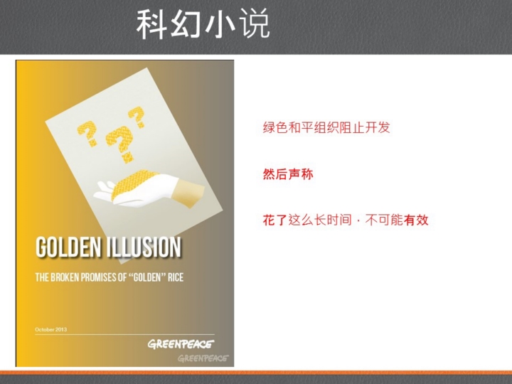 这是反转基因运动的科幻小说出现之处[RR21]。他们发现黄金大米实际上是一种药物。不只是食物,还是药品。转基因技术給人类带来的带来的巨大好处之一就是人胰岛素。如果您患有糖尿病,就需要服用人类胰岛素。那它是哪里来的呢?,它并不是来自人类,它来自被改造过用来生产人用胰岛素的细菌或酵母。这是转基因生物。您是否听说过绿色和平组织对此表示负面意见?我从未听到过任何有关他们的负面消息。但这也是转基因生物,我认为他们应该将二者同等对待。 |
