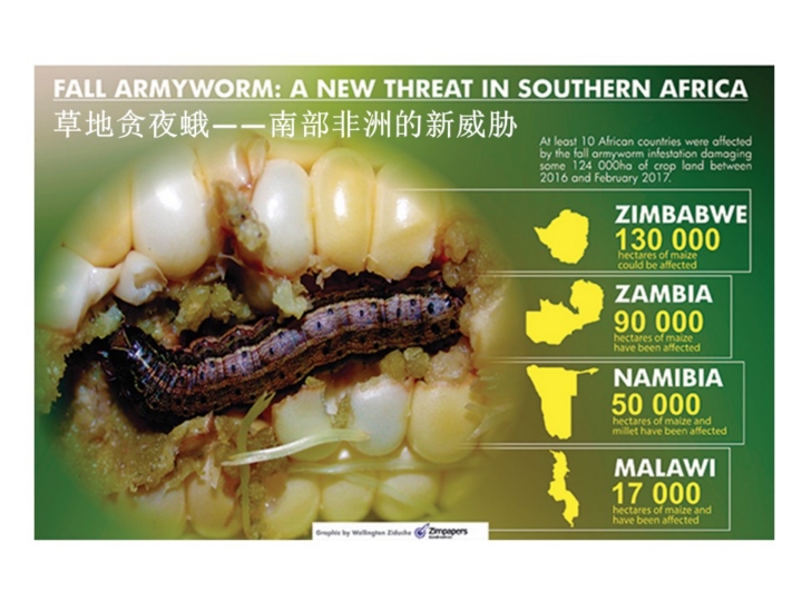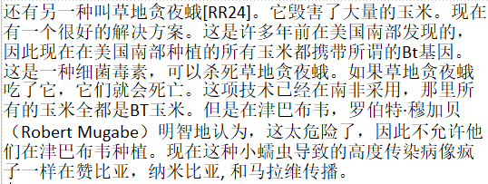还有另一种叫草地贪夜蛾[RR24]。它毁害了大量的玉米。现在有一个很好的解决方案。这是许多年前在美国南部发现的,因此现在在美国南部种植的所有玉米都携带所谓的Bt基因。这是一种细菌毒素,可以杀死草地贪夜蛾。如果草地贪夜蛾吃了它,它们就会死亡。这项技术已经在南非采用,那里所有的玉米全都是BT玉米。但是在津巴布韦,罗伯特·穆加贝(Robert Mugabe)明智地认为,这太危险了,因此不允许他们在津巴布韦种植。现在这种小蠕虫导致的高度传染病像疯子一样在赞比亚,纳米比亚, 和马拉维传播。 Please see a screen shot of notes if you have a problem to view some characters. ![]() |