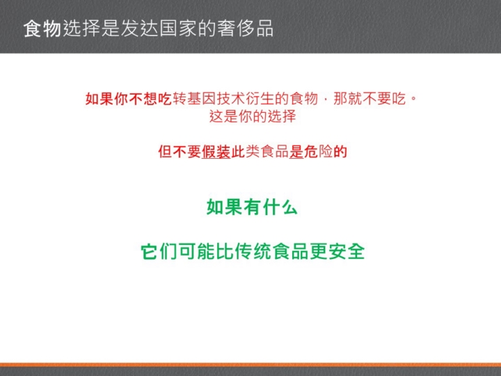 最基本道理就是,如果您不想吃转基因方法衍生的食物,那就不要。这是您的选择。没有人让你吃任何东西。但是,它们可能比传统食品更安全。不要说您不吃它们是因为它们很危险。