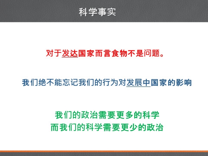 对于发达国家而言,除了分配不公平外,食物并不是真正的问题,但是对于发展中国家[RR29]来说,食物是一个主要问题,不仅是食物的数量,还在于营养食品的价值,而所有这些都可以使用转基因方法加以改善。最重要的是,我们在政治上需要更多的科学知识,理想情况下,在科学上需要更少的政治知识。
