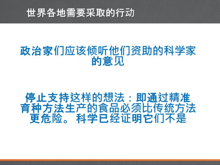 政客们应该听-听他们资助的科学家的意见[RR30]。为什么要资助他们?您知道,如果您不想听他们的实验结果,为什么要资助他们?政客们应该停止支持这样的观念,那就是使用精密方法生产的食品一定带有危险性。科学表明事实并非如此。我们找不到任何一个证据。在欧洲,您不允许种植转基因食品,但他们却进口了数百万吨的转基因食品来喂养动物包括牛,猪,和其他任何动物。数百万吨的转基因大豆进入欧洲。欧洲人显然不担心他们的动物。这些东西对他们的动物来说是绝对安全的,对人类来说这是不好的。对此,我未敢苟同。无论是传统大豆还是转基因大豆,它们的味道都很好。