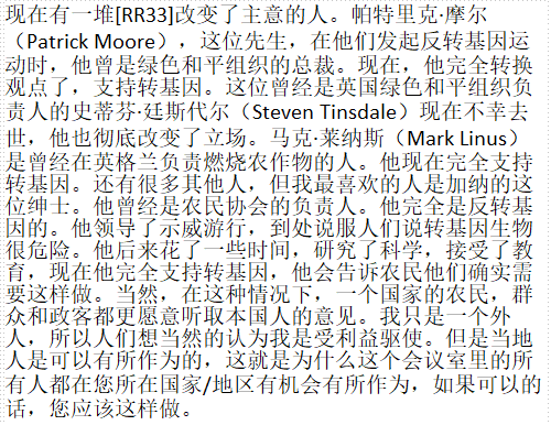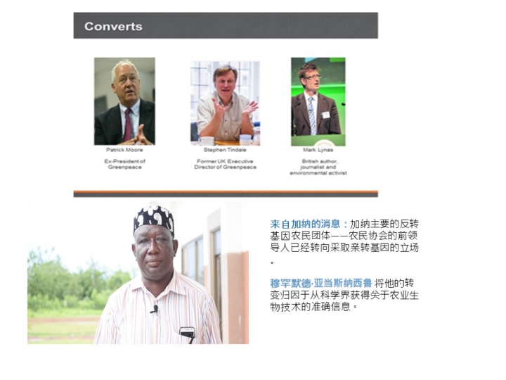 现在有一堆[RR33]改变了主意的人。帕特里克·摩尔(Patrick Moore),这位先生,在他们发起反转基因运动时,他曾是绿色和平组织的总裁。现在,他完全转换观点了,支持转基因。这位曾经是英国绿色和平组织负责人的史蒂芬·廷斯代尔(Steven Tinsdale)现在不幸去世,他也彻底改变了立场。马克·莱纳斯(Mark Linus)是曾经在英格兰负责燃烧农作物的人。他现在完全支持转基因。还有很多其他人,但我最喜欢的人是加纳的这位绅士。他曾经是农民协会的负责人。他完全是反转基因的。他领导了示威游行,到处说服人们说转基因生物很危险。他后来花了一些时间,研究了科学,接受了教育,现在他完全支持转基因,他会告诉农民他们确实需要这样做。当然,在这种情况下,一个国家的农民,群众和政客都更愿意听取本国人的意见。我只是一个外人,所以人们想当然的认为我是受利益驱使。但是当地人是可以有所作为的,这就是为什么这个会议室里的所有人都在您所在国家/地区有机会有所作为,如果可以的话,您应该这样做。 Please see a screen shot of notes if you have a problem to view some characters.