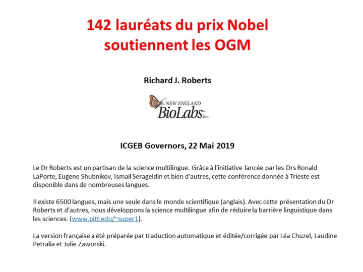 142 Nobel Laureates support GMOs. In French lecture by Richard J. Roberts Original PPT file - http://www.pitt.edu/~super7/56011-57001/56281.ppt Original English Lecture - http://www.pitt.edu/~super1/lecture/lec56201/index.htm