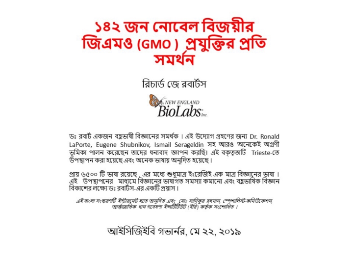 142 Nobel Laureates support GMOs lecture by by Richard J. Roberts in Bangla/Bengali