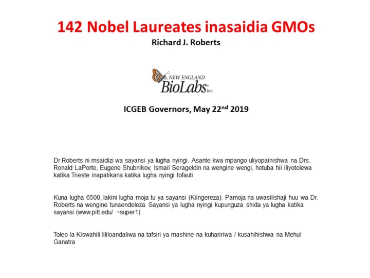 142 Nobel Laureates support GMOs. By Richard J. Roberts, BioLabs Swahili version compiled by machine translation and edited by Mehul Ganatra