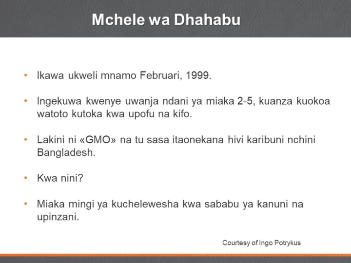 Mchele wa Dhahabu na Zaidi ya hayo - changamoto za mradi wa kibinadamu wa GMO. 1999 ilikuwa wakati [RR20] walipata hii kwanza katika maabara na kawaida kutoka wakati huo inachukua miaka michache kabla ya mazao kuwa tayari shamba. 1999, miaka 20 iliyopita. Lakini ni GMO. Na sasa, mwaka huu mwishowe tutaona hii. Na shukrani kwa Bangladesh, kwa maeneo yote, Bangladesh ilikuwa na serikali ambayo iligundua kuwa hii ni kitu ambacho kilistahili kufuata. |