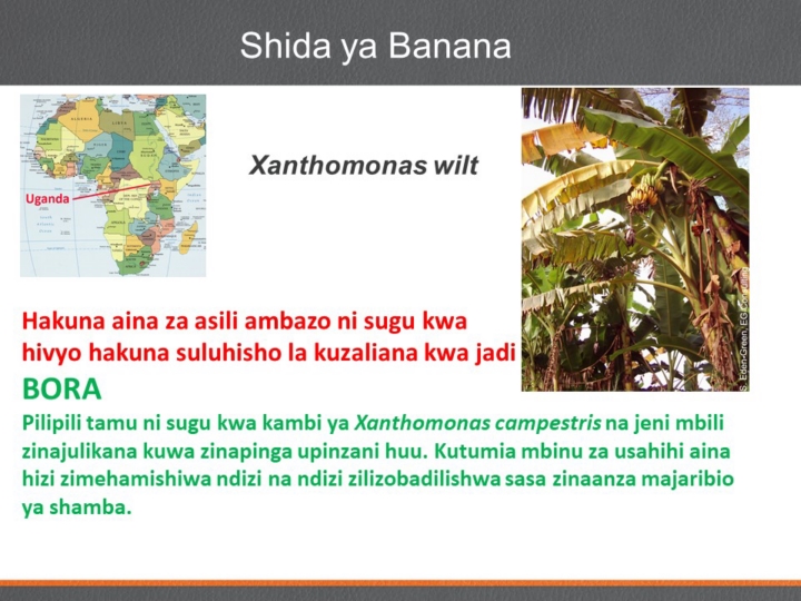 Sasa nitapita haraka kupitia ugonjwa mmoja au mbili ambazo zimetishia nchi za Afrika ambazo zinaweza kutatuliwa kwa urahisi sana. Kwanza kabisa ni Xanthomonas wilt [RR23]. Hii ni ugonjwa wa bakteria ambao unaua ndizi. Hakuna suluhisho la asili kwa hivyo mtu hawezi njia za jadi ili kuzitatua. Hakuna toleo la ndizi ambalo ni sugu kwa asili kwa hii. Lakini pilipili tamu zina jini mbili ndani yao. Ukihamisha jeni hizi kuwa ndizi na sasa ndizi ni sugu kwa Xanthomonas wilt. |