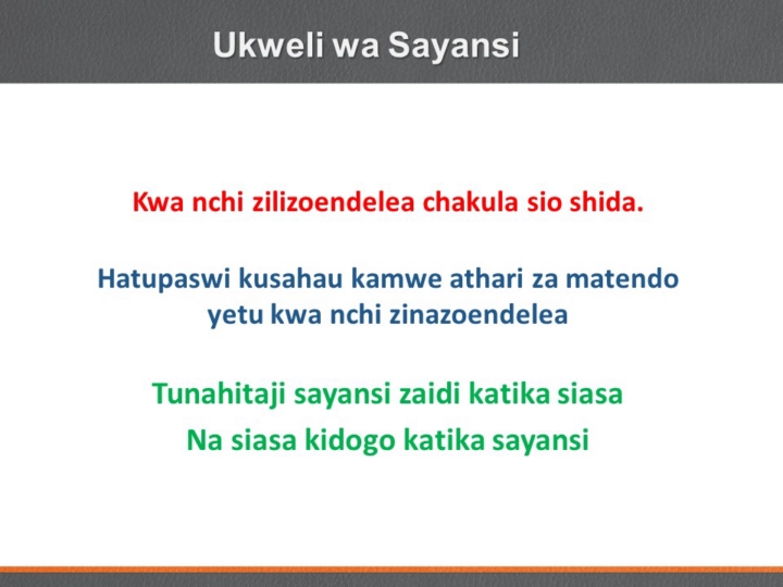 Kwa nchi zilizoendelea chakula sio shida kabisa isipokuwa kwa ile ambayo haigawi kwa haki kwa watu masikini, lakini kwa nchi zinazoendelea [RR29] ni shida kubwa na sio wingi wa chakula tu, ni thamani ya lishe ya chakula na yote haya yanaweza kuboreshwa kwa kutumia njia za GM. Jambo la msingi ni kwamba tunahitaji sayansi zaidi katika siasa na walau, siasa kidogo katika sayansi. |