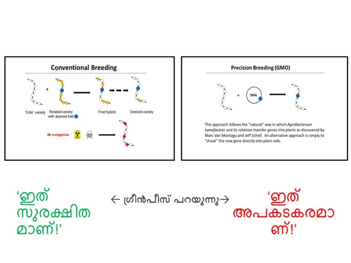 ഞാൻ നിങ്ങളോട് പറയുന്ന ശാസ്ത്രവുമായി നേരിട്ട് ബന്ധപ്പെടുന്ന ഒരേയൊരു കാര്യം ഇതാണ്, മാത്രമല്ല ഇത് പ്രേക്ഷകരിൽ ശാസ്ത്രജ്ഞരല്ലാത്ത ആളുകൾക്ക് മാത്രമുള്ളതാണ്. പരമ്പരാഗത ബ്രീഡിംഗ്, എന്താണ് സംഭവിക്കുന്നതെന്ന് ഞങ്ങൾ [RR8] കണ്ടെത്തിക്കഴിഞ്ഞാൽ, ലാബിൽ പരമ്പരാഗത ബ്രീഡിംഗ് ഞങ്ങൾക്ക് ചെയ്യാനാകുമെന്ന് ഞങ്ങൾ മനസ്സിലാക്കി, അതിനാൽ ഞങ്ങൾ അതിൽ പ്രവർത്തിക്കും, കൂടാതെ നിങ്ങൾ വിൽക്കുന്ന ഒരു നല്ല ഇനം ഇവിടെ നിങ്ങൾക്ക് ലഭിക്കുമെന്നതാണ് ആശയം , അതിനാൽ ഇതാണ് ഞങ്ങൾ ജോലിചെയ്യുകയും വിൽക്കുകയും ചെയ്യുന്നത്, പക്ഷേ ഇത് അൽപ്പം ഉയരത്തിൽ വളരണമെന്ന് ഞങ്ങൾ ആഗ്രഹിച്ചു, അല്ലെങ്കിൽ പഴയതിനേക്കാൾ അല്പം കൂടുതൽ ധാന്യം ഉത്പാദിപ്പിക്കാൻ ഞങ്ങൾ ആഗ്രഹിക്കുന്നു, അതിനാൽ ഞങ്ങൾ എന്തുചെയ്യും? നമുക്ക് ആവശ്യമുള്ള സ്വഭാവസവിശേഷതകളുള്ള ഒരു വൈൽഡ് വൈവിധ്യത്തെ ഞങ്ങൾ കണ്ടെത്തി, അത് ഇപ്പോൾ ഞങ്ങൾ വളർന്നു കൊണ്ടിരിക്കുന്ന ഒരു കുരിശിൽ കാണുന്നില്ല. നിങ്ങൾ ആദ്യമായി കുരിശ് ഉണ്ടാക്കിയ ശേഷം, പകുതി ജീനുകളും വരേണ്യ വർഗ്ഗത്തിൽ നിന്നാണ് വരുന്നത് (അവ ഇവിടെ കാണിക്കുന്ന വെളുത്തവയാണ്) പകുതി കാട്ടു വൈവിധ്യത്തിൽ നിന്നാണ് വരുന്നത് (അവ അവിടെ കാണപ്പെടുന്ന മഞ്ഞ ജീനുകളാണ്). ഇപ്പോൾ, നിങ്ങൾക്ക് ആവശ്യമുള്ള ജീൻ ഉള്ളവ തിരഞ്ഞെടുക്കാം, നിങ്ങൾക്ക് ആവശ്യമുള്ള സ്വഭാവസവിശേഷതകൾ ഉണ്ട്, പക്ഷേ അവ മറ്റ് നിരവധി ജീനുകളും അവിടെ ഇടുന്നു, അത് നിങ്ങൾക്ക് ആവശ്യമില്ലായിരിക്കാം. അതിനാൽ നിങ്ങൾ ഇപ്പോൾ ചെയ്യുന്നത്, നിങ്ങൾ ഈ സങ്കരയിനങ്ങളെ യഥാർത്ഥമായതിലേക്ക് കടത്തിക്കൊണ്ടിരിക്കുകയാണോ, അതിലൂടെ നിങ്ങൾ നിർമ്മിച്ച സങ്കരയിനങ്ങളിലേക്ക് യഥാർത്ഥ ജീൻ കൂടുതൽ കൂടുതൽ ചേർക്കുന്നത് തുടരുകയാണ്, ഒടുവിൽ നിങ്ങൾക്ക് ആവശ്യമുള്ള ഇനം ലഭിക്കും. നിങ്ങൾക്കാവശ്യമുള്ളത് (എന്താണ് സംഭവിക്കുന്നത്, ശരി!) കൂടാതെ ഇതിന് മറ്റ് നിരവധി സ്വഭാവഗുണങ്ങളും ഉണ്ട്, അവ എന്തിനുവേണ്ടിയാണെന്ന് ഞങ്ങൾക്ക് അറിയില്ല, പക്ഷേ അവ വളരുന്ന രീതിയെ ബാധിക്കുമെന്ന് തോന്നുന്നില്ല. പരമ്പരാഗതമായി വളർത്തുന്ന എന്തും നിങ്ങൾ നോക്കുമ്പോൾ, അതിലുള്ള ചില കാര്യങ്ങൾ നിങ്ങൾക്കറിയാമെന്നും എന്നാൽ നിങ്ങൾക്കറിയാത്ത ധാരാളം കാര്യങ്ങൾ ഉണ്ടെന്നും നിങ്ങൾ മനസ്സിലാക്കണം എന്നാണ് ഇതിനർത്ഥം. പരമ്പരാഗത ബ്രീഡിംഗിൽ നിന്നുള്ള പരിണതഫലങ്ങൾ ഞാൻ കാണിച്ചുതരാം. വലതുവശത്ത് മാർക്ക് വോൺ മൊണ്ടേഗ് കണ്ടെത്തിയ ബാക്ടീരിയകൾക്ക് ഡിഎൻഎയെ സസ്യങ്ങളിലേക്ക് മാറ്റാൻ കഴിഞ്ഞതായി കണ്ടെത്തി. അഗ്രോബാക്ടീരിയം എന്നറിയപ്പെടുന്ന എന്തെങ്കിലും അദ്ദേഹം പഠിച്ചു, അതിൽ ഒരു ചെറിയ ഡിഎൻഎ കഷണം ഉണ്ട് (ഞങ്ങൾ ഇതിനെ പ്ലാസ്മിഡ് എന്ന് വിളിക്കുന്നു) ബാക്ടീരിയയിൽ ഉണ്ട്, അഗ്രോബാക്ടീരിയം വളരാൻ ഇഷ്ടപ്പെടുന്ന സ