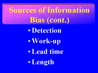 Detection bias is a systematic error in method of ascertainment, diagnosis or verification of cases. Workup bias occurs due to incompletely or incorrectly diagnosed cases. The lead time bias represents the amount of time by which the diagnosis has been advanced as a result of screening and can give a false impression of increased survival among screen-detected cases. Length bias could show beneficial effect of screening when differences in mortality resulted from detection of less rapidly fatal diseases through screening while more fatal diseases were diagnosed after development of symptoms regardless of the screening.