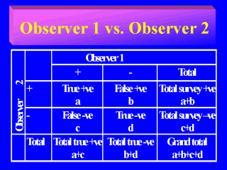 Sensitivity= a/(a+c) - Specificity= d/(b+d) - Predictive value of a positive test ( PVT+) = a/(a+b) - Predictive value of a negative test (PVT-) = d/(c+d) - Percentage of correct classification - Bias = (a+b)/(a+c) |