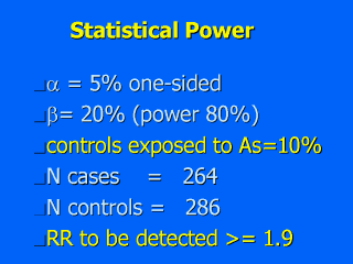 vicinity of the emission source Which parameter of the statistical power calculation is the limiting factor? -> the cases occurring in the observation perion in this selected district How can the power be improved? -> (1) increase the matching factor, but: The available budget allowed only a 1:1 frequency matching. -> (2) One-sided test can be taken into account, because a protective efffect of arsenic exposure on skin cancer development can likely be excluded. |