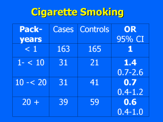 | Packyears: product of the duration of smoking (in years) and the numbers of cigarettes smoked per day divided by a package size of 20 cigarettes, summarized for different smoking periods What would justify to assume tobacco smoke as confounder or covariate? Consider (1) Tobacco smoke contains only small amounts of arsenic. (2) Smoking is a habit which may not vary spatially such as air pollution with arsenic. (3) How likely is a true ‚protective effect‘? A recall bias of the cases cannot be excluded. Whereas controls were mainly interviewed at home, cases were invited by their dermatologist to be interviewed at a dermatological outpatient service. Similar results for alcohol consumption support this potential bias (underreporting among cases). |