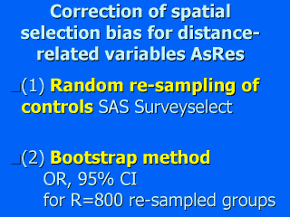 part) would result in a biased risk estimate. The SAS procedure SURVEYSELECT was applied for a random re-sampling of controls according to the spatial population distibution. A bootstrap method was applied to estimate the odds ratios from 800 re-sampled groups. |