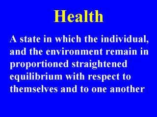 | As man is part of the environment, man’s health is affected by any disturbance in the balance within himself, within the environment, as well as, any imbalance in the interrelation between man and environment. Thus, health could be viewed as the state of universal equilibrium. |