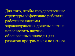 | For effective work of governmental health care system health providers should know and use evidence-based approaches for programme or policy development. |