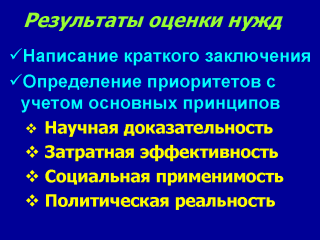 выбор приоритетов с учетом основных принципов: Научная доказательность. Насколько доказанным является применение того или иного метода профилактики или лечения? Какие виды доказательств учитывались? Затратная эффективность. Какой экономический эффект будет получен от внедрения программы профилактики? Какие требуются затраты? Через какое время можно ожидать результаты? Социальная применимость. Отвечает ли представленная программа социальным запросам населения? В какой степени она актуальна в современных условиях? Политическая реальность. Не принимается ли программа законодательными органами только ради ее принятия, ради каких либо политических амбиций, в качестве популистского решения? |