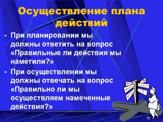 исполнителей, оценки. Периодическое обсуждение осуществления плана со всеми партнерами. Мониторирование всех действий для каждого этапа. |