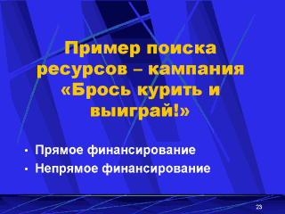 министерство здравоохранения. Непрямое финансирование – центр профилактической медицины, средства массовой информации, страховые компании, международные организации. Соотношение прямых и непрямых затрат – 1:5. |