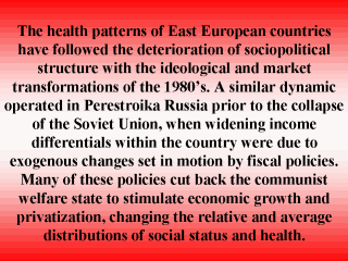 This paper defines the macro level determinant of health as social inequality, the variation in the distribution of social characteristics across groups living in small urban areas comprising the 33 administrative districts of the city of Moscow. |