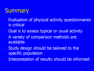 questionnaire is critical. - Because we are interested in the association between physical activity and disease, the goal is most often to assess typical or usual physical activity (energy expenditure). - Both subjective and objective comparison measures are available to validate questionnaires, each with their own strengths and weaknesses. - The study design should be based upon the time frame of the questionnaire, variation in physical activity, and consider subject burden. Ideally, comparison measures should be administered for a sufficient number of days to represent average activity.- Finally, because there is no perfect measure of typical or long-term energy expenditure, interpretation of results of validity/reproducibility studies should be informed by an understanding of the sources of error associated with both the questionnaire and the comparison method. |