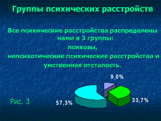 | Êàê âèäíî èç ðèñóíêà 3 • áîëüøèíñòâî îáñëåäîâàííûõ áîëüíûõ (458÷åë-57.3%) ñòðàäàåò óìñòâåííîé îòñòàëîñòüþ • âòîðîå ìåñòî çàíèìàþò íåïñèõîòè÷åñêèå ïñèõè÷åñêèå ðàññòðîéñòâà (269÷åë-33.7%) • òðåòüå ìåñòî-ïñèõîçû (72÷åë.-9%). |