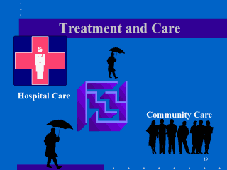 treatment may,in consequence be for months, years or even for life. Previously many patients spent weary years in long-stay care-the mental asylums. They became institutionalized. There was no effective therapy and they were simply looked after in a simple routine, the worst of their symptoms often "burned out’ but by that time they had lost all contact with family, friends ,work etc. Now many more patients can be cared for in the community after discharge from hospital. They may never need hospital admission or attend day hospital as part of therapy. Community care is expensive in the professional time and effort to look after patients in a social setting rather than an institution. There are more demands upon friends, family and social services but the results are much better. Long term medication, supervised therapy and intense rehabilitation all play their part. Medication:Anti-depressants, anti-psychotics, anxiolytics, mood stabilizers Electro-convulsive therapy (ECT) Psychotherapy-individual and group, Psychoanalysis Psychosurgery-Prefrontal leucotomy, temporal lobe surgery |