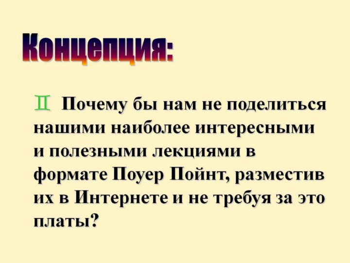 Мы ничего не терям, помещая наши лучшие лекции в в библиотеку лекций в Интернете. Мы обладаем всеми правими на наши слайды, а кроме этого, по нашим лучшим лекциям могут обучаться гораздо большее количество людей, а мы сами можем использовать лекции других преподавателей для улучшения наших собственных лекций. Пожалуйста, присылайте ваши собственные лекции для программы Суперкурс, посещаемость которых будет зафиксирована с помощью аналитических программ Гугл и сообщена вам по запросу. Загружайте и используйте любые необходимые вам материалы с сайта Суперкурса. |